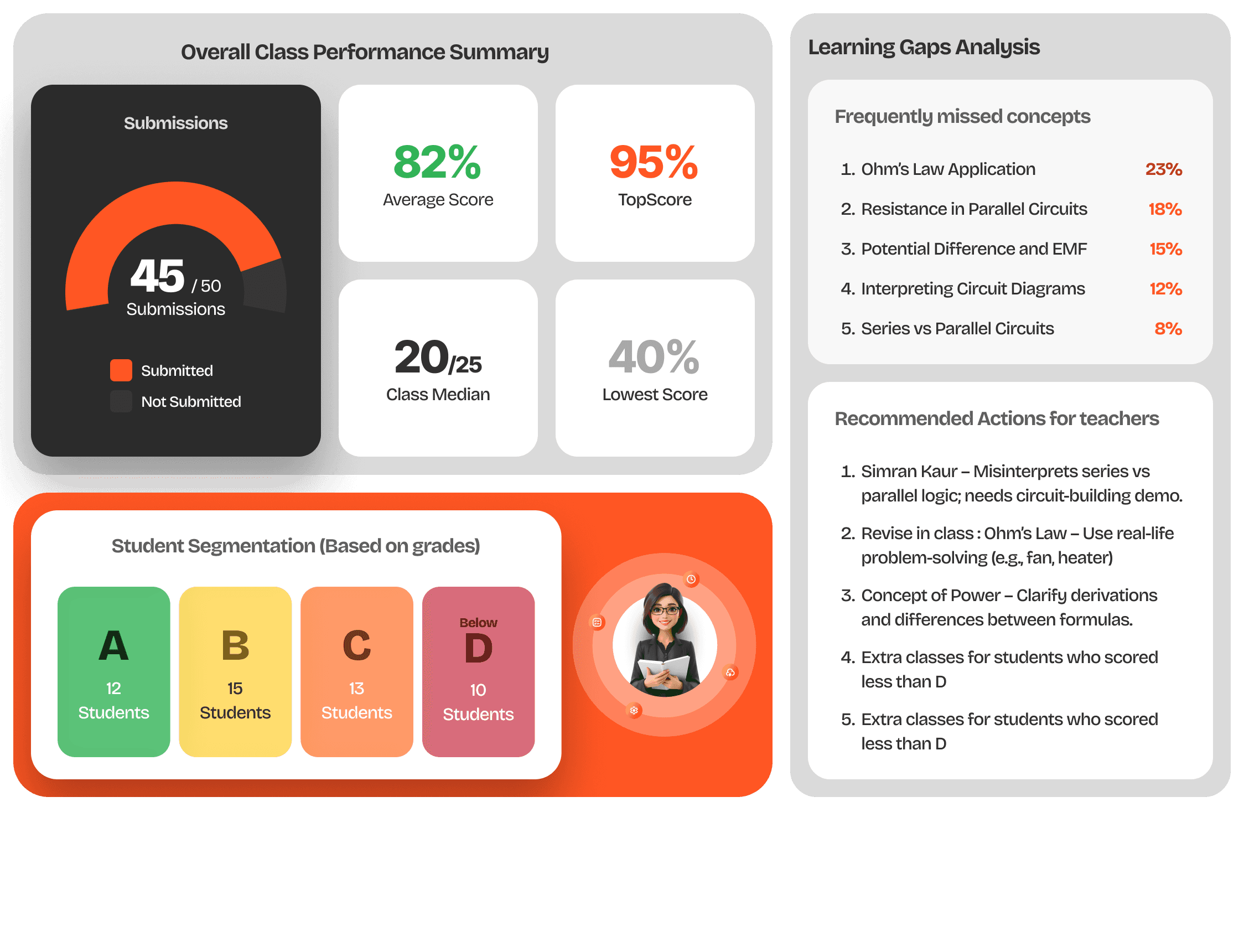 Visualize class trends, identify learning gaps, and make data-backed academic decisions.